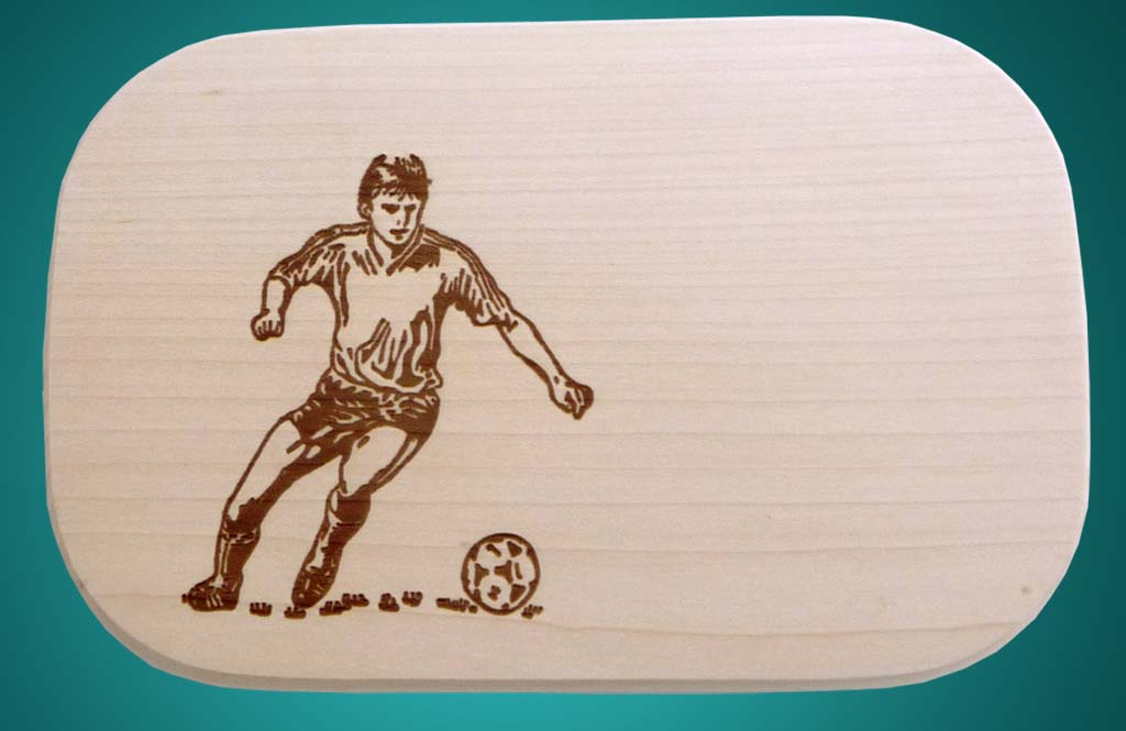Frühstücksbrettchen mit eingebrantem Motiv Fußballer. Das Brettchen besteht aus Ahornholz aus einem Stück, ohne Leimfuge die auseinandergehen kann.